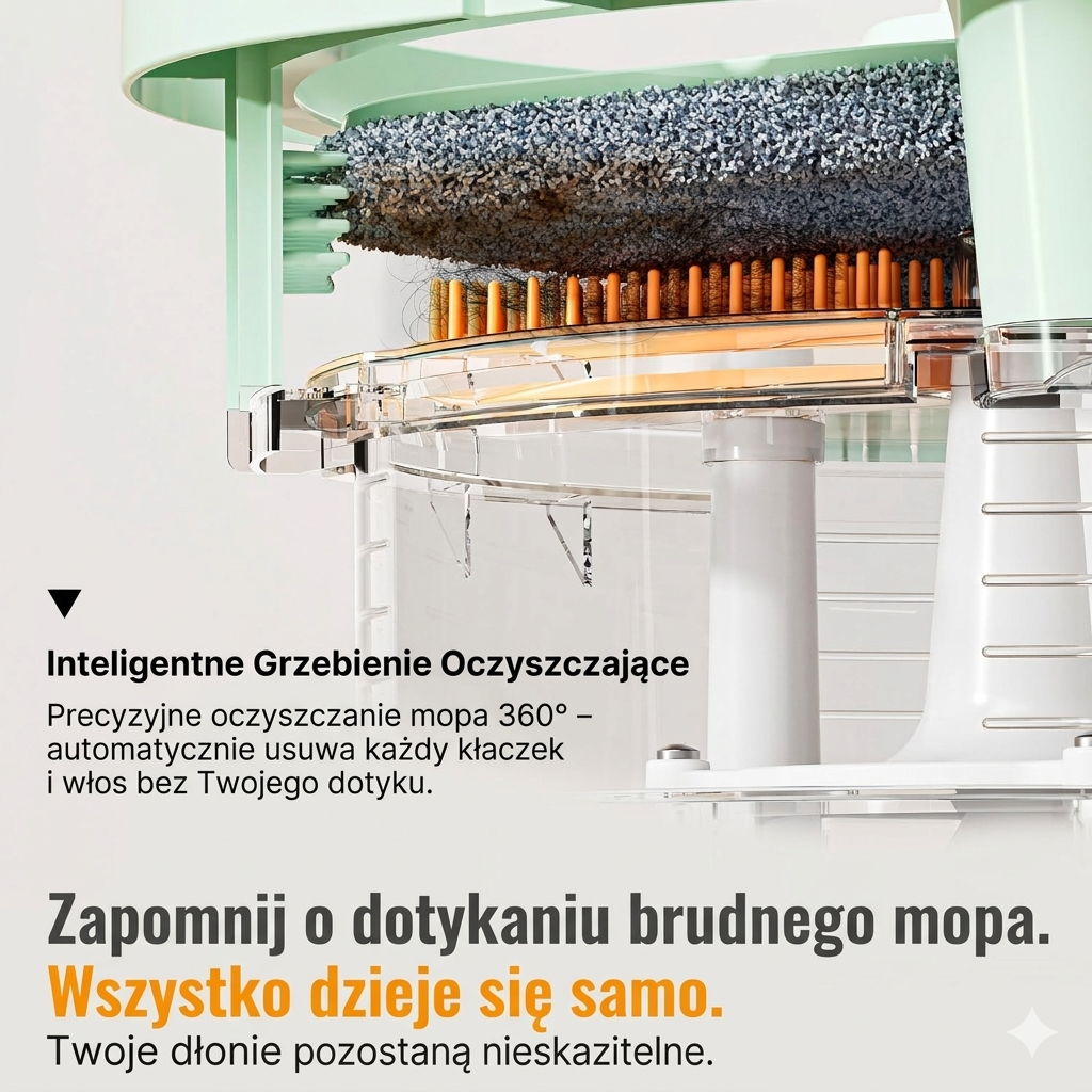 - Zero kontaktu z brudem: System 360° precyzyjnie wyczesuje każdą nitkę, włos i kłaczek prosto do brudnej wody. Ty tylko kręcisz – reszta dzieje się sama!